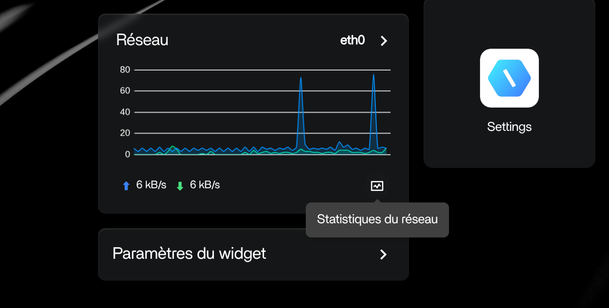 4. L'état du réseau internet (débit) - le nom de votre carte réseau connectée (ici 'eth0') -  l'icône des statistique renvoit à la page de l'état général du système