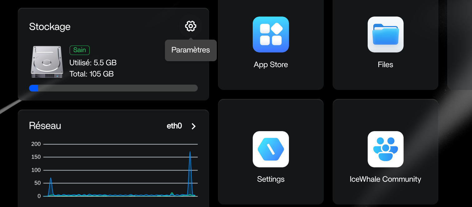 3. L'état du Stockage général - la roue crantée renvoit au tableau des Paramètres