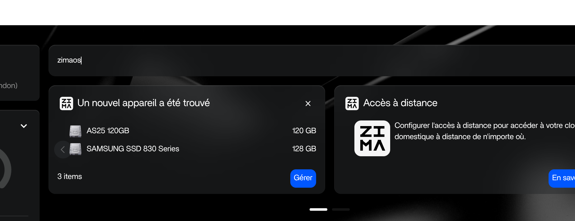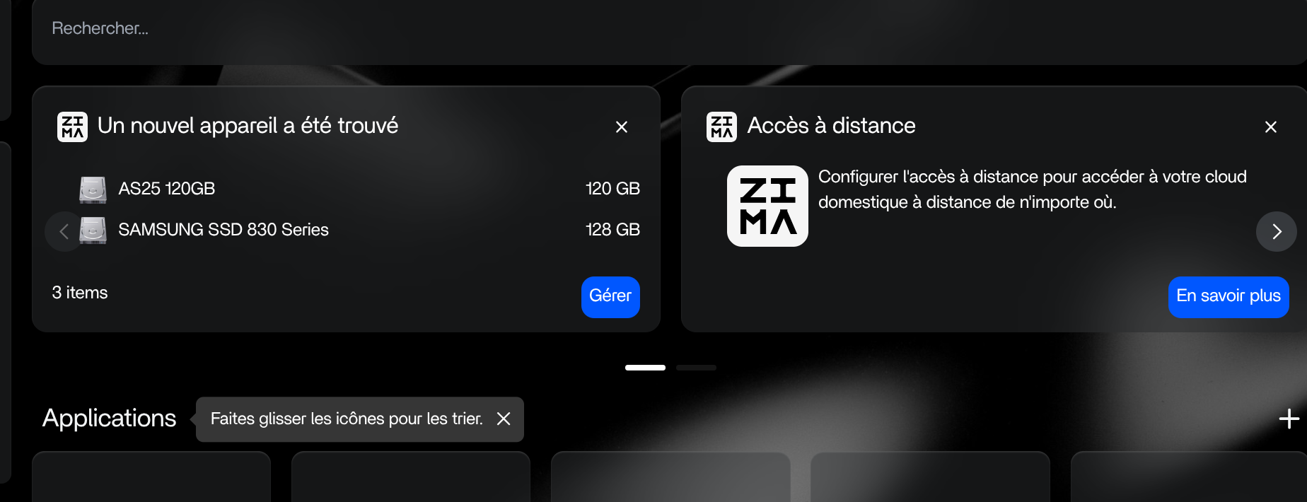 2. Des pop-up d'information des possibilités de fonctionnalité (ici configuration des disques durs, installation de l'accès distant ...)