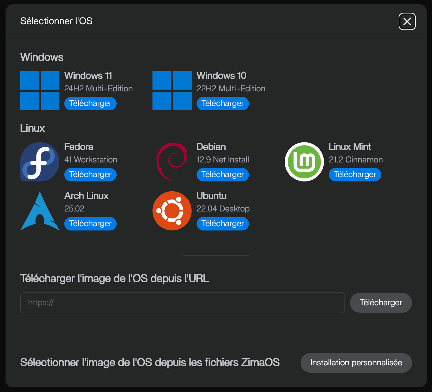 Côté droit : l'icône 'lettre' permet d'envoyer un courriel au support ZimaOS - l'icône 'bulle' est un raccourci d'accès au Forum - l'icône 'user' indique en mode pop-up une liste de raccourci pour suivre l'actu ZimaOS