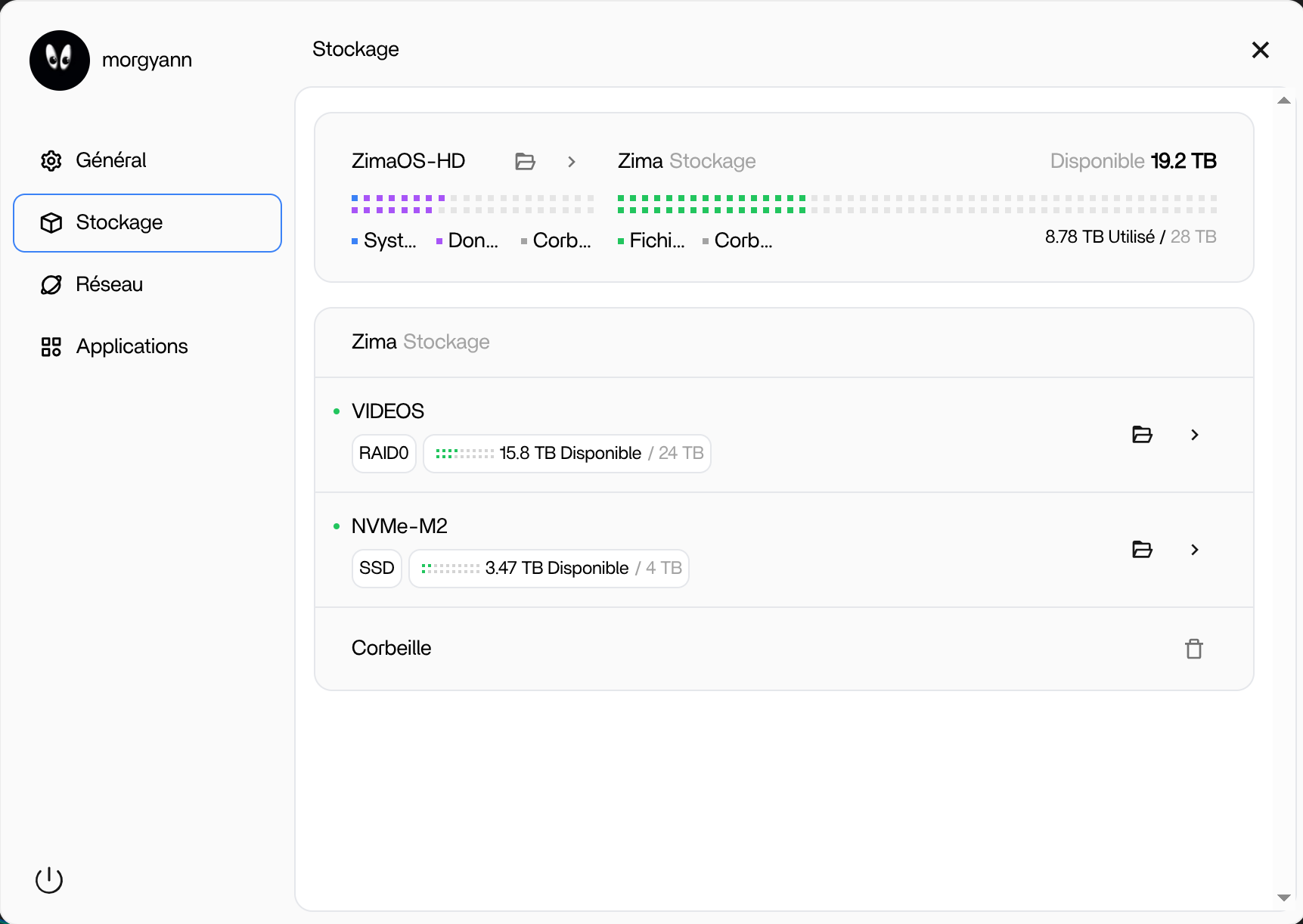 L'organisation du stockage peut s'articuler avec un (des) RAID et un (des) volume(s) DD seul(s)